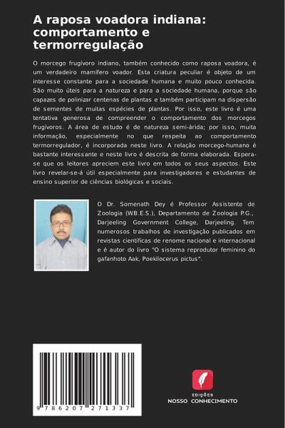 O morcego frugívoro indiano, também conhecido como raposa voadora, é um verdadeiro mamífero voador. Esta criatura peculiar é objeto de um interesse constante para a sociedade humana e muito pouco conhecida. São muito úteis para a natureza e para a sociedade humana, porque são capazes de polinizar centenas de plantas e também participam na dispersão de sementes de muitas espécies de plantas. Por isso, este livro é uma tentativa generosa de compreender o comportamento dos morcegos frugívoros. A área de estudo é de natureza semi-árida; por isso, muita informação, especialmente no que respeita ao comportamento termorregulador, é incorporada neste livro. A relação morcego-humano é bastante interessante e neste livro é descrita de forma elaborada. Espera-se que os leitores apreciem este livro em todos os seus aspectos. Este livro revelar-se-á útil especialmente para investigadores e estudantes de ensino superior de ciências biológicas e sociais.