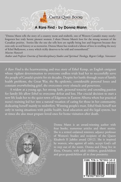 A Rare Find is the heartwarming and true story of Ethel Kemp, an English emigrant whose vigilant determination to overcome endless trials lead her to successfully serve the people of Canada's prairie for 6 decades. Despite her battle through years of family health problems, the Great War, the flu epidemic, considerable personal losses and constant overwhelming grief, she overcomes every obstacle and, perseveres. A widow at a young age, her strong faith, personal tenacity and unending passion for family life allow Ethel to overcome defeat and loss. Her crucial decision to start a new life leads her to the quiet town of Edgerton in Eastern Alberta where her practical nurse's training led her into a natural vocation of caring for those in her community, dedicating herself mainly to midwifery. Winning people's trust, she finds herself not only in taxing situations with public health, local education and the legal system, but at times she also must prepare loved ones for home visitation after death.