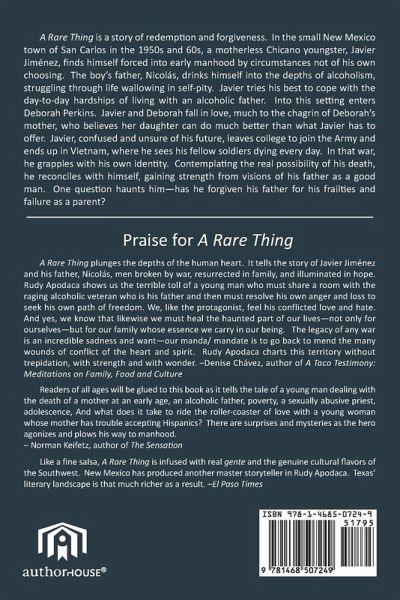 A Rare Thing is a story of redemption and forgiveness. In the small New Mexico town of San Carlos in the 1950s and 60s, a motherless Chicano youngster Javier Jimenéz, finds himself forced into an early manhood. The boy's father, Nicolás, a Korean War veteran, drinks himself into the depths of alcoholism, struggling through life wallowing in self-pity. Javier tries his best to cope not only with his own loneliness but the day-to-day hardships of living with an alcoholic father.  Into this setting enters Deborah Perkins. She moves into Javier's neighborhood. Javier and Deborah eventually fall in love, much to the chagrin of Deborah's mother, who doesn't' share her husband's fascination for Southwestern culture and believes her daughter can do much better than what Javier has to offer.  Tragedy strikes, and Javier moves to California to live with an aunt and uncle. Deborah and he struggle to continue their relationship despite the distance and Deborah's mother's prejudices. Confused and unsure of his future, Javier leaves college to join the Army and ends up in Vietnam, where he sees his fellow soldiers dying every day.  Reminiscing about his father, he must face his own mortality, as he grapples with his own identity. Nicolás's spirit appears at a critical moment with words to give Javier strength. Contemplating the real possibility of his death, he reconciles with himself, gaining strength from visions of his father as a good man who had his share of bad luck. Javier comes to grips with whether he has forgiven him for his frailties and failure as a parent.