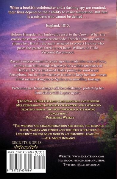 When a bookish codebreaker and a dashing spy are reunited, their lives depend on their ability to resist temptation. But fate is a mistress who cannot be denied. . . England, 1815.Heloise Hampden is a high-value asset to the Crown. When she cracks the enemy's most recent code, French agents are sent to silence her. But it's the agent assigned to protect Heloise who poses the greatest threat to her heart: William de l'Isle, Viscount Ravenwood.Raven's imprisonment six years ago has made him wary of love, but his heart still pounds whenever he's within ten paces of Heloise. He's a shadowed Hades pining for sun-kissed Persephone, but he'll do whatever it takes to keep her safe-even if that means taking her to Spain as an unwilling hostage.Protecting her from danger will be a challenge; protecting her from desire will be pure agony. Praise for K. C. Bateman's books: "[To Steal a Heart] is rich with espionage and suspense. Multidimensional believable characters and fast-paced plotting propel the story forward to its moving conclusion."-Publishers Weekly "The writing and characterization are superb, the romance is hot, snarky and tender and the hero is delicious. I couldn't ask for much more in an historical romance"-All About Romance