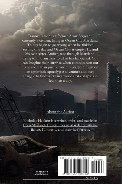 Danny Carson is a former Army Sergeant, currently a civilian, living in Ocean City Maryland. Things start going wrong when he finishes surfing one day and Ocean City is empty. He and his twin sister Amber, race through Maryland, trying to find answers to what has happened. You can imagine their surprise when zombies turn out to be more than just horror movies. Join them on an optimistic apocalypse adventure and they struggle to find safety in a world that collapses in less than a day.