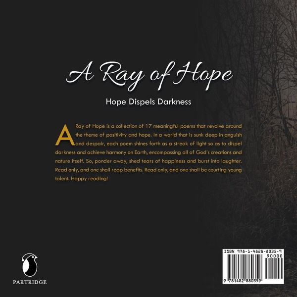 A Ray of Hope is a collection of 17 meaningful poems that revolve around the theme of positivity and hope. In a world that is sunk deep in anguish and despair, each poem shines forth as a streak of light so as to dispel darkness and achieve harmony on Earth, encompassing all of God's creations and nature itself. So, ponder away, shed tears of happiness and burst into laughter. Read only, and one shall reap benefits. Read only, and one shall be courting young talent. Happy reading!