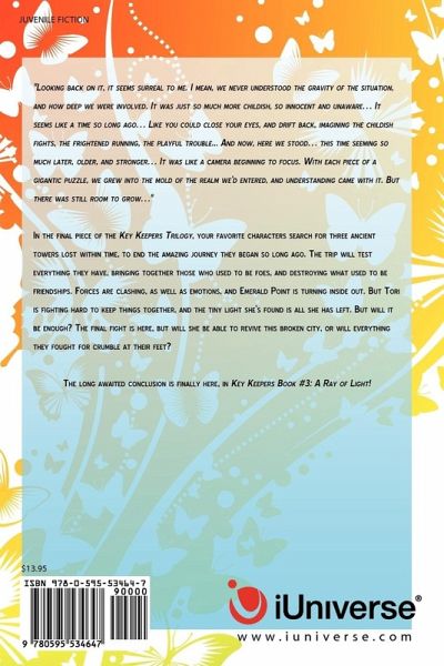 "Looking back on it, it seems surreal to me. I mean, we never understood the gravity of the situation, and how deep we were involved. It was just so much more childish, so innocent and unaware It seems like a time so long ago Like you could close your eyes, and drift back, imagining the childish fights, the frightened running, the playful trouble... And now, here we stood this time seeming so much later, older, and stronger It was like a camera beginning to focus. With each piece of a gigantic puzzle, we grew into the mold of the realm we'd entered, and understanding came with it. But there was still room to grow " In the final piece of the Key Keepers Trilogy, your favorite characters search for three ancient towers lost within time, to end the amazing journey they began so long ago. The trip will test everything they have, bringing together those who used to be foes, and destroying what used to be friendships. Forces are clashing, as well as emotions, and Emerald Point is turning inside out. But Tori is fighting hard to keep things together, and the tiny light she's found is all she has left. But will it be enough? The final fight is here, but will she be able to revive this broken city, or will everything they fought for crumble at their feet? The long awaited conclusion is finally here, in Key Keepers Book #3: A Ray of Light!