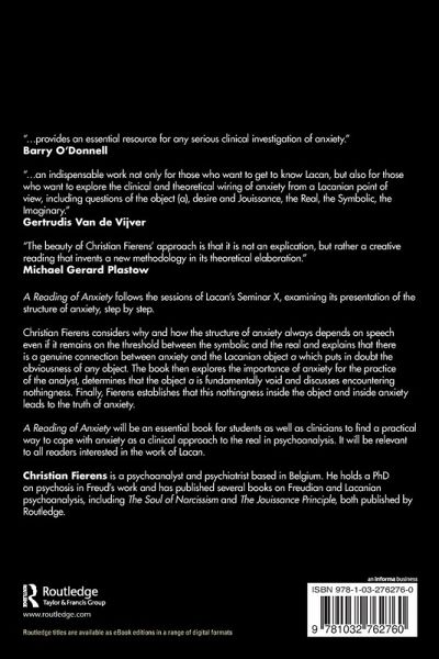 Christian Fierens considers why and how the structure of anxiety always depends on speech even if it remains on the threshold between the symbolic and the real and explains that there is a genuine connection between anxiety and the Lacanian object a which puts in doubt the obviousness of any object. The book then explores the importance of anxiety for the practice of the analyst, determines that the object a is fundamentally void and discusses encountering nothingness. Finally, Fierens establishes that this nothingness inside the object and inside anxiety leads to the truth of anxiety.