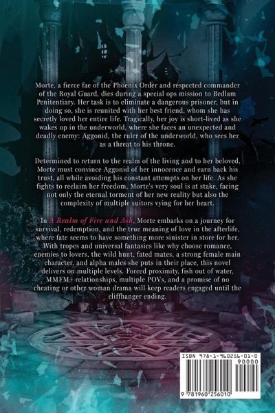 Morte, a fierce fae of the Phoenix order and a respected commander of the Royal Guard, meets an untimely demise during a special ops mission to Bedlam Penitentiary. Her task is to eliminate a dangerous prisoner, but in doing so, she is reunited with her best friend, whom she has secretly loved for her entire life. Tragically, her joy is short-lived as she dies and wakes up in the underworld, where she faces an unexpected and deadly enemy, Aggonid - the ruler of the underworld, who sees her as a threat to his throne. Determined to return to the realm of the living and to her beloved, Morte must convince Aggonid of her innocence and earn back his trust, all while avoiding his constant attempts on her life. As she fights to reclaim her freedom, Morte's very soul is at stake, not only facing the eternal torment of her new reality, but also navigating the complexity of multiple suitors vying for her heart. Will Morte find a way back to the realm and the one she loves, or will she be forced to choose between them? A Realm of Fire and Ash is a tale of one fae's journey for survival, redemption, and the true meaning of love in the afterlife, where fate seems to have something more sinister in store for her. Tropes and universal fantasies include:Why choose romance, where she has multiple love interests and can keep them all Enemies to lovers Wild hunt Fated mates Strong female main character Alpha males she puts in their place Forced proximity Fish out of water MMFM+ Multiple POV No cheating No other woman drama Ends on a cliffhanger