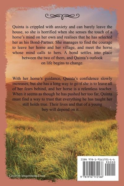 Quinta is crippled with anxiety and can barely leave the house, so she is horrified when she senses the touch of a horse's mind on her own and realises that he has selected her as his Bond-Partner. She manages to find the courage to leave her home and her village, and meet the horse whose mind calls to hers. A bond settles into place between the two of them, and Quinta's outlook on life begins to change. With her horse's guidance, Quinta's confidence slowly increases, but she has a long way to go if she is to leave all of her fears behind, and her horse is a relentless teacher. When it seems as though he has pushed her too far, Quinta must find a way to trust that everything he has taught her still holds true. Their lives and that of a young boy will depend on it...