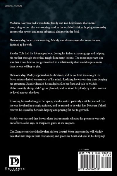 Madison Bowman had a wonderful family and two best friends that meant everything to her. She was working hard in the world of fashion, hoping to someday become the newest and most influential designer in the field. Then one day, in a chance meeting, Maddy met the one man she knew she was destined to be with. Zander Cole had his life mapped out. Losing his father at a young age and helping his mother through the ordeal taught him many lessons. The most important one was that it was best to not get involved in a relationship that would require more than he was willing to give. Then one day, Maddy appeared on his horizon, and he couldn't seem to get the feisty, auburn-haired woman out of his mind. Realizing he was wasting time denying his attraction, Zander decided he needed to face his fears and talk to Maddy. Unfortunately, things didn't go as planned, and he stood helplessly by as the woman he loved ran out the door. Knowing he needed to give her space, Zander waited patiently until he learned that she was involved in a tragic accident, and he rushed to be with her. Not sure if she'd recover, he stayed by her side, hoping and praying for her to get well. Maddy was touched that he was there but uncertain whether his presence was truly out of love, as he says, or misplaced guilt, as she suspects. Can Zander convince Maddy that his love is true? More importantly, will Maddy take that next step in their relationship and place her heart and soul in his keeping?