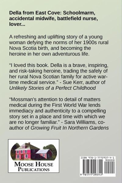Della from East Cove: Schoolmarm, accidental midwife, battlefield nurse, lover... A refreshing and uplifting story of a young woman defying the norms of her 1900s rural Nova Scotia birth, and becoming the heroine in her own adventurous life. "I loved this book. Della is a brave, inspiring, and risk-taking heroine, trading the safely of her rural Nova Scotian family for active war-time medical service." - Sue Kerr, author of Unlikely Stories of a Perfect Childhood "Mossman's attention to detail of matters medical during the First World War lends immediacy and authenticity to a compelling story set in a place and time with which we are no longer familiar." - Sara Williams, co-author of Growing Fruit In Northern Gardens