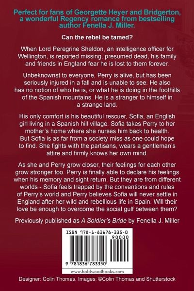 Perfect for fans of Georgette Heyer and Bridgerton, a wonderful Regency romance from bestselling author Fenella J. Miller. Can the rebel be tamed? When Lord Peregrine Sheldon, an intelligence officer for Wellington, is reported missing, presumed dead, his family and friends in England fear he is lost to them forever. Unbeknownst to everyone, Perry is alive, but has been seriously injured in a fall and is unable to see. He also has no notion of who he is, or what he is doing in the foothills of the Spanish mountains. He is a stranger to himself in a strange land. His only comfort is his beautiful rescuer, Sofia, an English girl living in a Spanish hill village. Sofia takes Perry to her mother's home where she nurses him back to health. But Sofia is as far from a society miss as one could hope to find. She fights with the partisans, wears a gentleman's attire and firmly knows her own mind. As she and Perry grow closer, their feelings for each other grow stronger too. Perry is finally able to declare his feelings when his memory and sight return. But they are from different worlds - Sofia feels trapped by the conventions and rules of Perry's world and Perry believes Sofia will never settle in England after her wild and rebellious life in Spain. Will their love be enough to overcome the social gulf between them? Please note: This was previously published as A Soldier's Bride by Fenella J. Miller A wonderful Regency romance perfect for fans of Jane Austen, Georgette Heyer and Mary Balogh. Praise for Fenella J. Miller: 'Yet again, Fenella Miller has thrilled me with another of her historical stories. She brings alive a variety of emotions and weaves in facts relating to the era, all of which keep me reading into the small hours.' Glynis Peters- Bestselling author of The Secret Orphan. 'Curl up in a chair with Fenella J Miller's characters and lose yourself in another time and another place.'Lizzie Lane 'Engaging characters and setting which whisks you back to the home front of wartime Britain. A fabulous series!' Jean Fullerton 'Loved every word of this book. Fenella is a great author and leaves her books with you wanting more. I can't wait to read the next one.' 5 star Reader Review