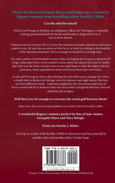 Perfect for fans of Georgette Heyer and Bridgerton, a wonderful Regency romance from bestselling author Fenella J. Miller. Can the rebel be tamed? When Lord Peregrine Sheldon, an intelligence officer for Wellington, is reported missing, presumed dead, his family and friends in England fear he is lost to them forever. Unbeknownst to everyone, Perry is alive, but has been seriously injured in a fall and is unable to see. He also has no notion of who he is, or what he is doing in the foothills of the Spanish mountains. He is a stranger to himself in a strange land. His only comfort is his beautiful rescuer, Sofia, an English girl living in a Spanish hill village. Sofia takes Perry to her mother's home where she nurses him back to health. But Sofia is as far from a society miss as one could hope to find. She fights with the partisans, wears a gentleman's attire and firmly knows her own mind. As she and Perry grow closer, their feelings for each other grow stronger too. Perry is finally able to declare his feelings when his memory and sight return. But they are from different worlds - Sofia feels trapped by the conventions and rules of Perry's world and Perry believes Sofia will never settle in England after her wild and rebellious life in Spain. Will their love be enough to overcome the social gulf between them? Please note: This was previously published as A Soldier's Bride by Fenella J. Miller A wonderful Regency romance perfect for fans of Jane Austen, Georgette Heyer and Mary Balogh. Praise for Fenella J. Miller: 'Yet again, Fenella Miller has thrilled me with another of her historical stories. She brings alive a variety of emotions and weaves in facts relating to the era, all of which keep me reading into the small hours.' Glynis Peters- Bestselling author of The Secret Orphan. 'Curl up in a chair with Fenella J Miller's characters and lose yourself in another time and another place.'Lizzie Lane 'Engaging characters and setting which whisks you back to the home front of wartime Britain. A fabulous series!' Jean Fullerton 'Loved every word of this book. Fenella is a great author and leaves her books with you wanting more. I can't wait to read the next one.' 5 star Reader Review