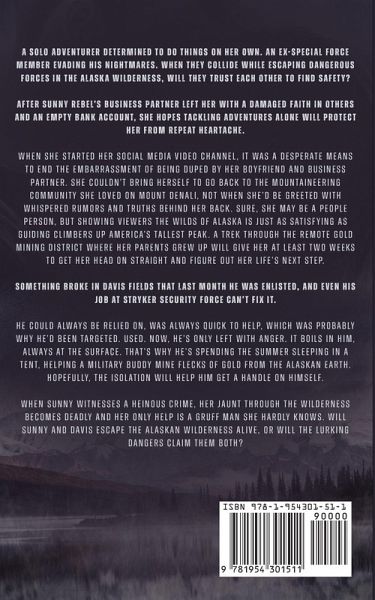 A solo adventurer determined to do things on her own. An ex-special force member evading his nightmares. When they collide while escaping dangerous forces in the Alaska wilderness, will they trust each other to find safety? After Sunny Rebel's business partner left her with a damaged faith in others and an empty bank account, she hopes tackling adventures alone will protect her from repeat heartache. When she started her social media video channel, it was a desperate means to end the embarrassment of being duped by her boyfriend and business partner. She couldn't bring herself to go back to the mountaineering community she loved on Mount Denali, not when she'd be greeted with whispered rumors and truths behind her back. Sure, she may be a people person, but showing viewers the wilds of Alaska is just as satisfying as guiding climbers up America's tallest peak. A trek through the remote gold mining district where her parents grew up will give her at least two weeks to get her head on straight and figure out her life's next step. Something broke in Davis Fields that last month he was enlisted, and even his job at Stryker Security Force can't fix it. He could always be relied on, was always quick to help, which was probably why he'd been targeted. Used. Now, he's only left with anger. It boils in him, always at the surface. That's why he's spending the summer sleeping in a tent, helping a military buddy mine flecks of gold from the Alaskan earth. Hopefully, the isolation will help him get a handle on himself. When Sunny witnesses a heinous crime, her jaunt through the wilderness becomes deadly and her only help is a gruff man she hardly knows. Will Sunny and Davis escape the Alaskan wilderness alive, or will the lurking dangers claim them both?