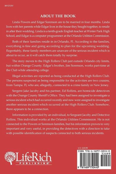 ABOUT THE BOOK Linda Powers and Edgar Sorenson are to be married in four months. Linda lives with her parents while Edgar lives in the house they bought together, to reside in after their wedding. Linda is a tenth-grade English teacher at Winter Park High School, and Edgar is a computer programmer at the Orlando Utilities Commission. Both of their families reside in in Orlando, Fl. According to the families, everything is fine and going according to plan for the upcoming wedding. Regrettably, these family members are unaware of the serious incident which is about to occur, as it will catch them totally by surprise. The story moves to the High Rollers Club just outside Orlando city limits, but within Orange County. Edgar's brother, Jim Sorenson, works part-time at the Club while attending college. Illegal activities are reported as being conducted at the High Rollers Club. The persons suspected as being responsible for the activities are two cousins, from Tampa. Fl, who are, allegedly, connected to a crime family in New Jersey. Sergent Jake Jacoby and his partner, Ed Rollins, are homicide detectives with the Orange County Sheriff's Office. They had been assigned to investigate a serious incident which had occurred recently and now were assigned to investigate another serious incident which occurred at the High Rollers Club. Somehow, there appears to be a connection. Information is provided by an individual, to Sergeant Jacoby and Detective Rollins. This individual works at the Orlando Utilities Commission. He is not connected to the Powers or Sorenson families, but his information proves to very important and very useful, in providing the detectives with a direction to take with possible identification of suspects connected to both serious incidents.