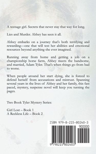 A teenage girl. Secrets that never stay that way for long. Lies and Murder. Abbey has seen it all. Abbey embarks on a journey that's both terrifying and rewarding-one that will test her abilities and emotional resources beyond anything she ever imagined. Running away from home and getting a job on a championship horse farm, Abbey meets the handsome, and married, Adam Tyler. That's when things go from bad to worse. When people around her start dying, she is forced to defend herself from accusations and mistrust. Spanning several years in the lives of Abbey and her family, this fast paced, mystery, suspense novel will keep you turning the pages. Get your copy now! Two Book Tyler Mystery Series: Girl Lost - Book 1 A Reckless Life - Book 2