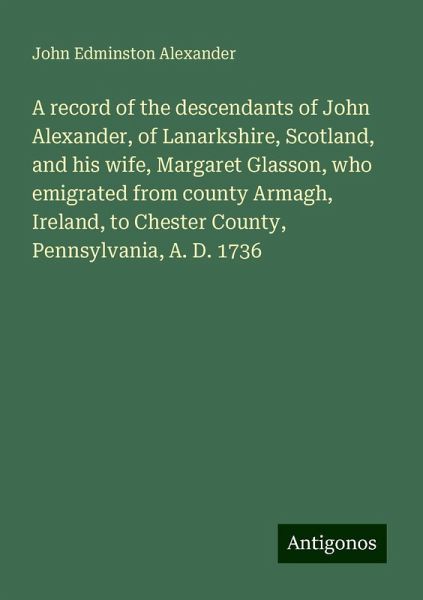 A record of the descendants of John Alexander, of Lanarkshire, Scotland, and his wife, Margaret Glasson, who emigrated from county Armagh, Ireland, to Chester County, Pennsylvania, A. D. 1736 - Alexander, John Edminston