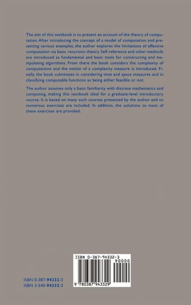 The aim of this textbook is to present an account of the theory of computation. After introducing the concept of a model of computation and presenting various examples, the author explores the limitations of effective computation via basic recursion theory. Self-reference and other methods are introduced as fundamental and basic tools for constructing and manipulating algorithms. From there the book considers the complexity of computations and the notion of a complexity measure is introduced. Finally, the book culminates in considering time and space measures and in classifying computable functions as being either feasible or not. The author assumes only a basic familiarity with discrete mathematics and computing, making this textbook ideal for a graduate-level introductory course. It is based on many such courses presented by the author and so numerous exercises are included. In addition, the solutions to most of these exercises are provided.