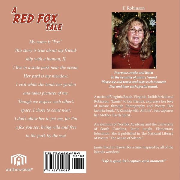 A Red Fox Tale My name is "Fox". This story is true about my friendship with a human, JJ. I live in a state park near the ocean. Her yard is my meadow. I visit while she tends her garden and takes pictures of me. Though we respect each other's space, I chose to come near. I don't allow her to pet me, for I'm a fox you see, living wild and free in the park by the sea!