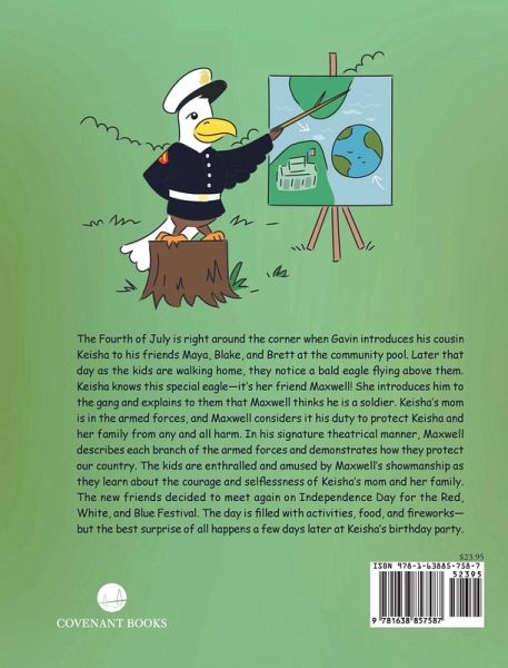 The Fourth of July is right around the corner when Gavin introduces his cousin Keisha to his friends Maya, Blake, and Brett at the community pool. Later that day as the kids are walking home, they notice a bald eagle flying above them. Keisha knows this special eagle-it's her friend Maxwell! She introduces him to the gang and explains to them that Maxwell thinks he is a soldier. Keisha's mom is in the armed forces, and Maxwell considers it his duty to protect Keisha and her family from any and all harm. In his signature theatrical manner, Maxwell describes each branch of the armed forces and demonstrates how they protect our country. The kids are enthralled and amused by Maxwell's showmanship as they learn about the courage and selflessness of Keisha's mom and her family. The new friends decided to meet again on Independence Day for the Red, White, and Blue Festival. The day is filled with activities, food, and fireworks-but the best surprise of all happens a few days later at Keisha's birthday party.