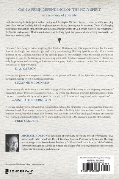For the Spirit, being somewhat forgotten is an occupational hazard. The Holy Spirit is so actively involved in our lives that we can take his presence for granted. As they say, familiarity breeds contempt. Just as we take breathing for granted, we can take the Holy Spirit for granted simply because we constantly depend on him. Like the cane that soon feels like an extension of the blind man's own body, we too easily begin to think of the Holy Spirit as an extension of ourselves. Yet the Spirit is at the center of the action in the divine drama from Genesis 1:2 all the way to Revelation 22:17. The Spirit's work is as essential as the Father's and the Son's, yet the Spirit's work is always directed to the person and work of Christ. In fact, the efficacy of the Holy Spirit's mission is measured by the extent to which we are focused on Christ. The Holy Spirit is the person of the Trinity who brings the work of the Father, in the Son, to completion. In everything that the Triune God performs, this perfecting work is characteristic of the Spirit. In Rediscovering the Holy Spirit, author, pastor, and theologian Mike Horton introduces readers to the neglected person of the Holy Spirit, showing that the work of God's Spirit is far more ordinary and common than we realize. Horton argues that we need to take a step back every now and again to focus on the Spirit himself--his person and work--in order to recognize him as someone other than Jesus or ourselves, much less something in creation. Through this contemplation we can gain a fresh dependence on the Holy Spirit in every area of our lives.
