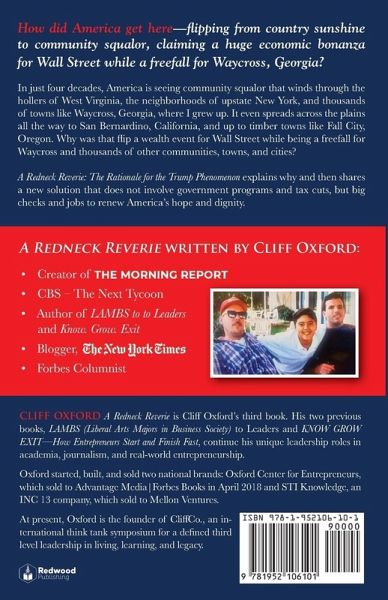 How did America get here-flipping from country sunshine to community squalor, claiming a huge economic bonanza for Wall Street while a freefall for Waycross, Georgia? In just four decades, America is seeing community squalor that winds through the hollers of West Virginia, the neighborhoods of upstate New York, and thousands of towns like Waycross, Georgia, where I grew up. It even spreads across the plains all the way to San Bernardino, California, and up to timber towns like Fall City, Oregon. Why was that flip a wealth event for Wall Street while being a freefall for Waycross and thousands of other communities, towns, and cities? A Redneck Reverie: The Rationale for the Trump Phenomenon explains why and then shares a new solution that does not involve government programs and tax cuts, but big checks and jobs to renew America's hope and dignity.