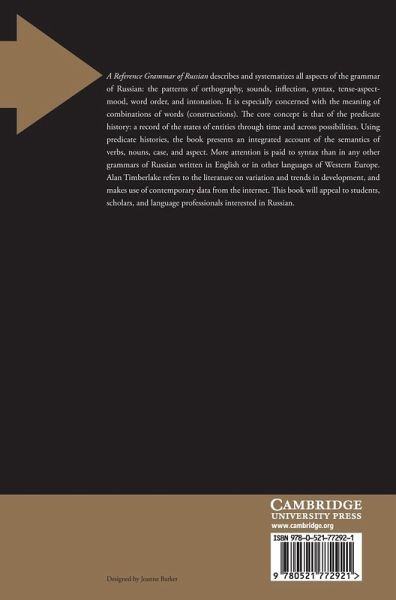 This book describes and systematizes all aspects of the grammar of Russian: the patterns of orthography, sounds, inflection, syntax, tense-aspect-mood, word order, and intonation. It is especially concerned with the meaning of combinations of words (constructions). The core concept is that of the predicate history: a record of the states of entities through time and across possibilities. Using predicate histories, the book presents an integrated account of the semantics of verbs, nouns, case, and aspect. More attention is paid to syntax than in any other grammars of Russian written in English or in other languages of Western Europe. Alan Timberlake refers to the literature on variation and trends in development, and makes use of contemporary data from the internet. This book will appeal to students, scholars and language professionals interested in Russian.