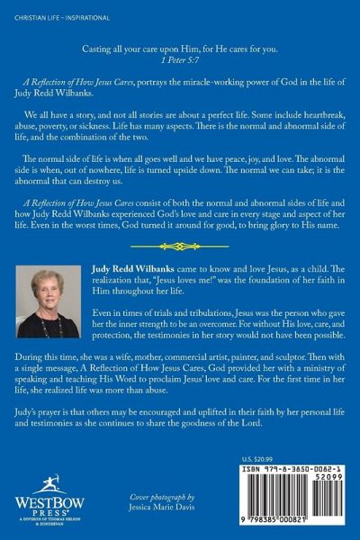 Casting all your care upon Him, for He cares for you. 1 Peter 5:7 A Reflection of How Jesus Cares, portrays the miracle-working power of God in the life of Judy Redd Wilbanks. We all have a story, and not all stories are about a perfect life. Some include heartbreak, abuse, poverty, or sickness. Life has many aspects. There is the normal and abnormal side of life, and the combination of the two. The normal side of life is when all goes well and we have peace, joy, and love. The abnormal side is when, out of nowhere, life is turned upside down. The normal we can take; it is the abnormal that can destroy us. A Reflection of How Jesus Cares consist of both the normal and abnormal sides of life and how Judy Redd Wilbanks experienced God's love and care in every stage and aspect of her life. Even in the worst times, God turned it around for good, to bring glory to His name.