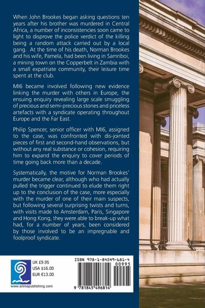 When John Brookes began asking questions ten years after his brother was murdered in Central Africa, a number of inconsistencies soon came to light to disprove the police verdict of the killing being a random attack carried out by a local gang. At the time of his death, Norman Brookes and his wife, Pamela, had been living in Samriboi, a mining town on the Copperbelt in Zambia with a small expatriate community, their leisure time spent at the club. MI6 became involved following new evidence linking the murder with others in Europe, the ensuing enquiry revealing large scale smuggling of precious and semi-precious stones and priceless artefacts with a syndicate operating throughout Europe and the Far East. Philip Spencer, senior officer with MI6, assigned to the case, was confronted with dis-jointed pieces of first and second-hand observations, but without any real substance or cohesion, requiring him to expand the enquiry to cover periods of time going back more than a decade. Systematically, the motive for Norman Brookes' murder became clear, although who had actually pulled the trigger continued to elude them right up to the conclusion of the case, more especially with the murder of one of their main suspects, but following several surprising twists and turns, with visits made to Amsterdam, Paris, Singapore and Hong Kong, they were able to break-up what had, for a number of years, been considered by those involved to be an impregnable and foolproof syndicate.