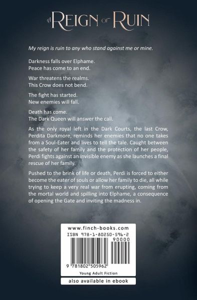 My reign is ruin to any who stand against me or mine. Darkness falls over Elphame. Peace has come to an end. War threatens the realms. This Crow does not bend. The fight has started. New enemies will fall. Death has come. The Dark Queen will answer the call. As the only royal left in the Dark Courts, the last Crow, Perdita Darkmore, reminds her enemies that no one takes from a Soul-Eater and lives to tell the tale. Caught between the safety of her family and the protection of her people, Perdi fights against an invisible enemy as she launches a final rescue of her family. Pushed to the brink of life or death, Perdi is forced to either become the eater of souls or allow her family to die, all while trying to keep a very real war from erupting, coming from the mortal world and spilling into Elphame, a consequence of opening the Gate and inviting the madness in.