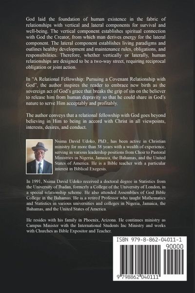 God laid the foundation of human existence in the fabric of relationships with vertical and lateral components for survival and well-being. The vertical component establishes the spiritual connection with God the Creator, from which man derives the energy for the lateral component. The lateral component establishes living paradigms and outlines healthy development and maintenance rules, obligations, and responsibilities. Therefore, whether vertically or laterally, human relationships are designed to be a two-way street, requiring reciprocal obligation or joint action. In "A Relational Fellowship: Pursuing a Covenant Relationship with God", the author inspires the reader to embrace new birth as the sovereign act of God's grace that breaks the grip of sin on the believer to release him from human depravity so that he could share in God's nature to serve Him acceptably and profitably. The author conveys that a relational fellowship with God goes beyond believing in Him to being in accord with Christ in all viewpoints, interests, desires, and conduct.