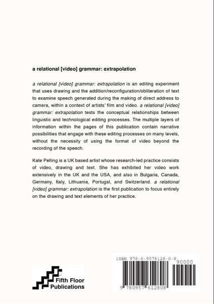 a relational [video] grammar: extrapolation by Kate Pelling is an editing experiment that uses drawing and the addition/reconfiguration/obliteration of text to examine speech generated during the making of direct address to camera, within a context of artists' film and video. a relational [video] grammar: extrapolation tests the conceptual relationships between linguistic and technological editing processes. The multiple layers of information within the pages of this publication contain narrative possibilities that engage with these editing processes on many levels, without the necessity of using the format of video beyond the recording of the speech.
