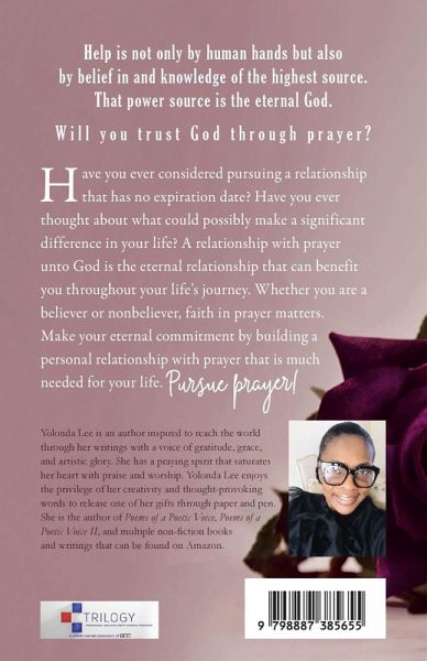 Help is not only by human hands but also by belief in and knowledge of the highest source. That power source is the eternal God. Will you trust God through prayer? Have you ever considered pursuing a relationship that has no expiration date? Have you ever thought about what could possibly make a significant difference in your life? A relationship with prayer unto God is the eternal relationship that can benefit you throughout your life's journey. Whether you are a believer or nonbeliever, faith in prayer matters. Make your eternal commitment by building a personal relationship with prayer that is much needed for your life. Pursue prayer!