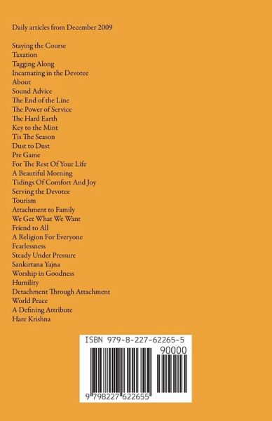 Daily articles from December 2009 Staying the Course Taxation Tagging Along Incarnating in the Devotee About Sound Advice The End of the Line The Power of Service The Hard Earth Key to the Mint Tis The Season Dust to Dust Pre Game For The Rest Of Your Life A Beautiful Morning Tidings Of Comfort And Joy Serving the Devotee Tourism Attachment to Family We Get What We Want Friend to All A Religion For Everyone Fearlessness Steady Under Pressure Sankirtana Yajna Worship in Goodness Humility Detachment Through Attachment World Peace A Defining Attribute Hare Krishna The Supreme Controller