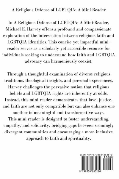 A Religious Defense of LGBTQIA: A Mini-ReaderSynopsis In A Religious Defense of LGBTQIA: A Mini-Reader, Michael E. Harvey offers a profound and compassionate exploration of the intersection between religious faith and LGBTQIA identities. This concise yet impactful mini-reader serves as a scholarly yet accessible resource for individuals seeking to understand how faith and LGBTQIA advocacy can harmoniously coexist. Through a thoughtful examination of diverse religious traditions, theological insights, and personal experiences, Harvey challenges the pervasive notion that religious beliefs and LGBTQIA rights are inherently at odds. Instead, this mini-reader demonstrates that love, justice, and faith are not only compatible but can also enhance one another in meaningful and transformative ways. This mini-reader is designed to foster understanding, empathy, and solidarity, bridging gaps between seemingly divergent communities and encouraging a more inclusive approach to faith and spirituality.Table of Contents Introduction The introduction sets the stage for the discussion, outlining the book's purpose and the importance of exploring the relationship between religion and LGBTQIA identities. It highlights the current climate of faith-based discrimination and introduces the central thesis that faith and LGBTQIA advocacy are not mutually exclusive. Chapter 1: Historical Context This chapter delves into the historical evolution of religious attitudes towards LGBTQIA individuals. It traces the origins of various doctrinal beliefs and explores how historical contexts have shaped religious perspectives on sexuality and gender. Chapter 2: Scriptural Interpretations In this chapter, Harvey examines key scriptural texts from various religious traditions that have been used to justify exclusionary practices against LGBTQIA individuals. He provides alternative interpretations that support the inclusion and acceptance of LGBTQIA identities within religious communities. Chapter 3: Theological Foundations This chapter explores the theological underpinnings of a religious defense of LGBTQIA rights. Harvey draws on concepts of divine love, justice, and the inherent worth of all individuals to build a case for the inclusion of LGBTQIA individuals in religious life. Chapter 4: Voices of Faith Here, Harvey presents personal narratives and testimonies from LGBTQIA individuals of faith. These voices provide firsthand accounts of the challenges and triumphs of reconciling religious beliefs with LGBTQIA identities, offering readers a diverse array of perspectives. Chapter 5: Building Inclusive Communities This chapter offers practical guidance for creating and sustaining inclusive religious communities. It provides strategies for fostering environments where LGBTQIA individuals feel welcome and valued, and where faith communities can embrace diversity. Chapter 6: Engaging in Dialogue Harvey discusses the importance of dialogue in bridging divides between faith and LGBTQIA communities. This chapter offers techniques for constructive conversations and explores ways to build mutual understanding and respect. Chapter 7: The Way Forward In the final chapter, Harvey looks ahead to future possibilities for the intersection of faith and LGBTQIA advocacy. He outlines potential pathways for continued progress and encourages readers to be agents of change in their own communities.