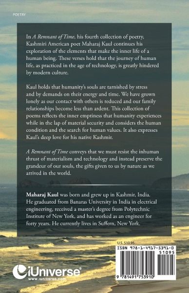 In A Remnant of Time, his fourth collection of poetry, Kashmiri American poet Maharaj Kaul continues his exploration of the elements that make the inner life of a human being. These verses hold that the journey of human life, as practiced in the age of technology, is greatly hindered by modern culture. Kaul holds that humanity's souls are tarnished by stress and by demands on their energy and time. We have grown lonely as our contact with others is reduced and our family relationships become less than ardent. This collection of poems reflects the inner emptiness that humanity experiences while in the lap of material security and considers the human condition and the search for human values. It also expresses Kaul's deep love for his native Kashmir. A Remnant of Time conveys that we must resist the inhuman thrust of materialism and technology and instead preserve the grandeur of our souls, the gifts given to us by nature as we arrived in the world.