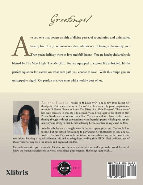 Anisah Hassan reside in St Louis MO. She is now introducing her third project A Rendezvous with Destiny". Her first is a a self help and inspirational memoir "A Flower Grows in Stone: The Diary of a Life in Progress". That's one of her main missions in this life, demystify and bring light to the plight of Stiff Person Syndrome and others that suffer. You are not alone. Now as she comes shining thought with her compassionate and heart felt poems which gives her the same joy and strength than before, allowing her to soar like an eagle and be free.