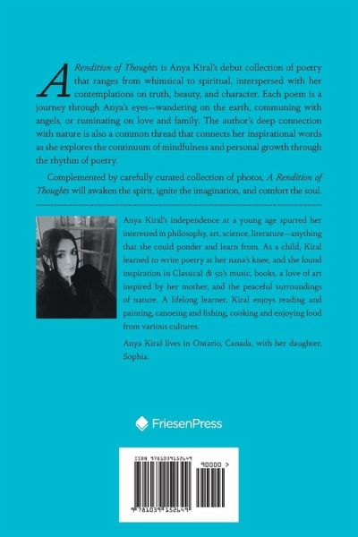 A Rendition of Thoughts is Anya Kiral's debut collection of poetry that ranges from whimsical to spiritual, interspersed with her contemplations on truth, beauty, and character. Each poem is a journey through Anya's eyes-wandering on the earth, communing with angels, or ruminating on love and family. The author's deep connection with nature is also a common thread that connects her inspirational words as she explores the continuum of mindfulness and personal growth through the rhythm of poetry. Complemented by carefully curated collection of photos, A Rendition of Thoughts will awaken the spirit, ignite the imagination, and comfort the soul.