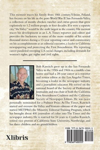 This memoir traces his family from 18th century Vilnius, Poland, but focuses on his life in the post-World War II San Fernando Valley, a collection of mostly chicken ranches and citrus groves that grew explosively to 1.2 million people in four decades. If it were a separate city, "the Valley" would be the sixth largest in the country. His memoir traces his development as an L.A. Times reporter and editor and provides the backstory to some of the more notable of his several thousand stories during a 13-year reporting career and commentary on his accomplishments as an editorial executive, a leader in California newspapering and protecting the First Amendment. His reporting career paralleled sweeping U.S. social changes, including demands for women's rights, gay rights and civil rights.