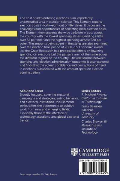 This Element explores election costs in 48 states, revealing wide variation across the country. It examines the impact of economic events like the Great Recession on spending, and the relationship between spending and election administration outcomes. It also finds a correlation between voters' confidence and perceptions of election fraud.