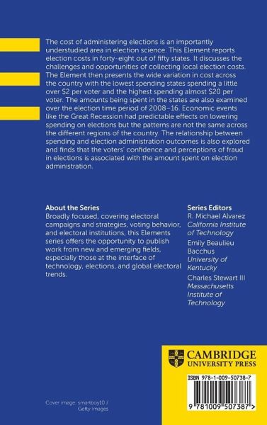 This Element explores election costs in 48 states, revealing wide variation across the country. It examines the impact of economic events like the Great Recession on spending, and the relationship between spending and election administration outcomes. It also finds a correlation between voters' confidence and perceptions of election fraud.