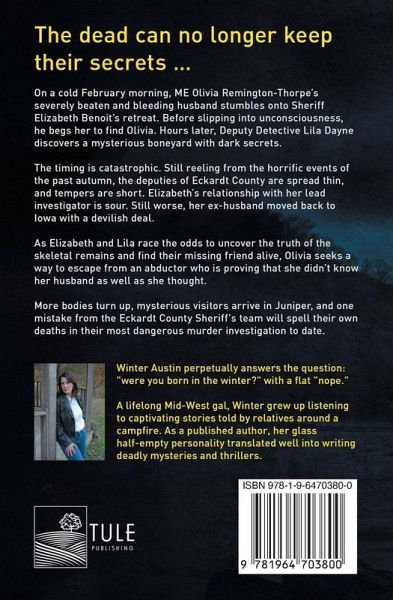 The dead can no longer keep their secrets ... On a cold February morning, ME Olivia Remington-Thorpe's severely beaten and bleeding husband stumbles onto Sheriff Elizabeth Benoit's retreat. Before slipping into unconsciousness, he begs her to find Olivia. Hours later, Deputy Detective Lila Dayne discovers a mysterious boneyard with dark secrets. The timing is catastrophic. Still reeling from the horrific events of the past autumn, the deputies of Eckardt County are spread thin, and tempers are short. Elizabeth's relationship with her lead investigator is sour. Still worse, her ex-husband moved back to Iowa with a devilish deal. As Elizabeth and Lila race the odds to uncover the truth of the skeletal remains and find their missing friend alive, Olivia seeks a way to escape from an abductor who is proving that she didn't know her husband as well as she thought. More bodies turn up, mysterious visitors arrive in Juniper, and one mistake from the Eckardt County Sheriff's team will spell their own deaths in their most dangerous murder investigation to date.