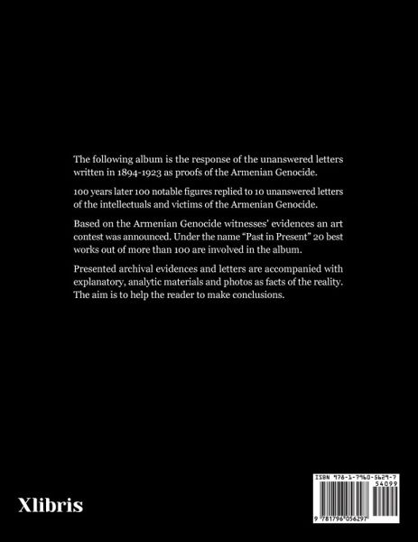 The following album is the response of the unanswered letters written in 1894-1923 as proofs of the Armenian Genocide. 100 years later 100 notable figures replied to 10 unanswered letters of the intellectuals and victims of the Armenian Genocide. Based on the Armenian Genocide witnesses' evidences an art contest was announced. Under the name "Past in Present" 20 best works out of more than 100 are involved in the album. Presented archival evidences and letters are accompanied with explanatory, analytic materials and photos as facts of the reality. The aim is to help the reader to make conclusions.