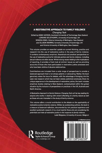 This volume provides an essential update on current thinking, practice and research into the use of restorative justice in the area of family violence. It contains contemporary empirical, theoretical and practical perspectives on the use of restorative justice for intimate partner and family violence, including sexual violence and elder abuse. Whilst raising issues relating to the implications of reporting, it provides a fresh look at victims' issues as well as providing accounts of those who have participated in restorative justice processes and who have been victims of abusive relationships. Contributions are included from a wide range of perspectives to provide a balanced approach that is not simply polemic or advocating. Rather, the book genuinely raises the issue for debate, with the advantage of bringing into the open new research which has not been widely published previously. Given its unique experience in the development of restorative justice, the book includes empirical studies relating to New Zealand, contextualized within the global situation by the inclusion of perspectives on practices in the UK, Australia and North America. This book will be key reading for people who work with violent offending of a family nature as well as for those who are interested in the study of family violence.