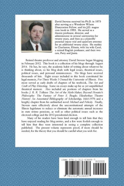 Retired theatre professor and attorney David Stevens began blogging in February 2012. This book is a collection of his blogs through August 2014. He has, he says, the academic habit of writing about whatever he is thinking about, so his blog deals with legal issues, theatrical issues, political issues, and personal reminiscences. Eight essays included in this book constituted his legal memoir, For Three Weeks I Owned the University of Illinois. Five more served as early drafts of chapters of his textbook, The Art and Craft of Play Directing. Some six essays make up his as yet unpublished theatrical memoir. Also included are portions of chapters from his other academic books, as well as a chapter from his yet-unfinished novel. Finally, Stevens rants effectively about the unconstitutional attempts of the Illinois legislature to reduce or eliminate the automatic annual increases in state retiree pensions, as well as other political issues such as the electoral college and the 2012 presidential election.