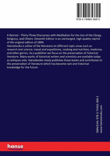 A Retreat - Thirty-Three Discourses with Meditation for the Use of the Clergy, Religious, and Others. Eleventh Edition is an unchanged, high-quality reprint of the original edition of 1894.