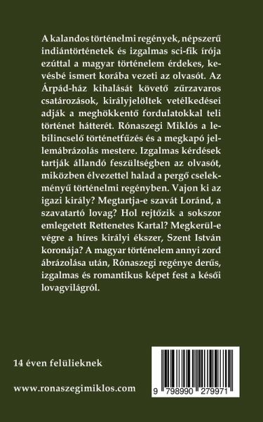 A kalandos történelmi regények, népszer¿ indiántörténetek és izgalmas sci-fik írója ezúttal a magyar történelem érdekes, kevésbé ismert korába vezeti az olvasót. Az Árpád-ház kihalását követ¿ z¿rzavaros csatározások, királyjelöltek vetélkedései adják a meghökkent¿ fordulatokkal teli történet hátterét. Rónaszegi Miklós a lebilincsel¿ történetf¿zés és a megkapó jellemábrázolás mestere. Izgalmas kérdések tartják állandó feszültségben az olvasót, miközben élvezettel halad a perg¿ cselekmény¿ történelmi regényben. Vajon ki az igazi király? Megtartja-e szavát Loránd, a szavatartó lovag? Hol rejt¿zik a sokszor emlegetett Rettenetes Kartal? Megkerül-e végre a híres királyi ékszer, Szent István koronája? A magyar történelem annyi zord ábrázolása után, Rónaszegi regénye der¿s, izgalmas és romantikus képet fest a kés¿i lovagvilágról. www.ronaszegimiklos.com