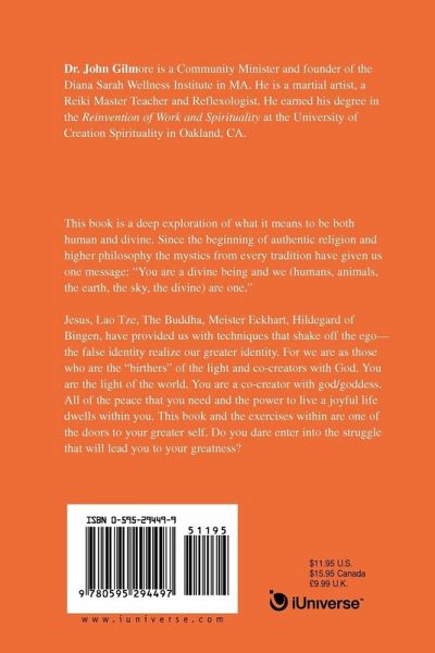 This book is a deep exploration of what it means to be both human and divine. Since the beginning of authentic religion and higher philosophy the mystics from every tradition have given us one message: "You are a divine being and we (humans, animals, the earth, the sky, the divine) are one." Jesus, Lao Tze, The Buddha, Meister Eckhart, Hildegard of Bingen, have provided us with techniques that shake off the ego--the false identity realize our greater identity. For we are as those who are the "birthers" of the light and co-creators with God. You are the light of the world. You are a co-creator with god/goddess. All of the peace that you need and the power to live a joyful life dwells within you. This book and the exercises within are one of the doors to your greater self. Do you dare enter into the struggle that will lead you to your greatness?