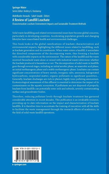 This book looks at the global ramifications of leachate characterization and environmental impacts, highlighting the different issues related to landfilling, such as leachate generation and its constituents. When water enters a landfill, it assimilates the dissolved components of the decomposing waste, thus forming a leachate with considerable impacts on the environment. The nature of the landfill and the waste received (household waste alone or mixed with industrial waste) determine whether the leachate produced is hazardous or not. The decomposition of solid waste in landfills goes through several stages, including an initial aerobic phase, an anaerobic acid phase, an initial methanogenic phase and a stable methanogenic phase. Leachates can contain significant concentrations of heavy metals, inorganic salts, ammonia, halogenated hydrocarbons, suspended matter, organic pollutants in significant quantities... Generally, leachate discharges are rich in phenol, highly toxic polluting ammonium. Ecotoxicological assessment of this effluent is essential to determine the impact of its contaminants on the aquatic ecosystem. If pollutants are not disposed of properly, leachate from landfills can potentially enter soils and subsoils, severely contaminating surface and groundwater bodies.