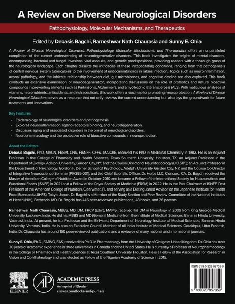 A Review of Diverse Neurological Disorders: Pathophysiology, Molecular Mechanisms, and Therapeutics offers an unparalleled compilation of the current understanding of neurodegenerative disorders. This book investigates the origins of mental disorders, encompassing bacterial and fungal invasions, viral assaults, and genetic predispositions, providing readers with a thorough grasp of the neurological landscape. Each chapter dissects the intricacies of these incapacitating conditions, ranging from the pathogenesis of central nervous system tuberculosis to the involvement of endocannabinoids in rabies infection. Topics such as neuroinflammation, axonal pathology, and the intricate relationship between diet, gut microbiomes, and cognitive decline are also explored. This book conducts an extensive examination of neurodegeneration, incorporating discussions on the role of probiotics and natural bioactive compounds in preventing ailments such as Parkinson’s, Alzheimer’s, and amyotrophic lateral sclerosis (ALS). With meticulous analyses of vitamins, micronutrients, antioxidants, and nutraceuticals, this work offers a roadmap for promoting neuroprotection. A Review of Diverse Neurological Disorders serves as a resource that not only reviews the current understanding but also lays the groundwork for future treatments and innovations.