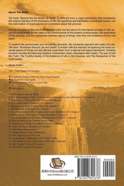 This book is different from a vague philosophy that emphasizes the original intention of the philosophy of life, the specificity and falsifiability of predicted results, and the examination of explanations and predictions about the universe. It is not the same as the search for absolute truth, but the search for the highest principle of self-recognition of all things on the basis of the consciousness of the present consciousness, the exploration of the universe, and the widespread common nature of things, free from the limitations of time and space. To explore the commonness and inevitability of events. We constantly approach the reality of truth. The book "Revolution Beyond Life and Death" is written with the intention of exploring the most universal aspects of things and the ultimate exploration from a rational and logical standpoint. Contents of which includes the following chapters: Postmortem Vision, Revelation after Death, The way to find the Truth, The Truthful Reality of the Existence of Life in the Universe, and The Perspective of the Truth Reality. * Author: Shan Tung Chang's Professions: ¿Vocational Trainer, Shek Pai Chun Hing Hospital ¿Professional Land Agent ¿Taiwan Taoyuan District Court Clerk ¿Publications: 1. A Revolution Beyond Death 2. The true meaning of life's existence and metamorphosis and sublimation (7 volumes) 3. Translation of Cheng Wei Shi Theory (10 volumes) 4. The Lanyan Sutra Explained (10 volumes) 5. Interpretation of the Lankan Sutra (10 volumes) 6. Interpretation of the Sutra (8 volumes) 7. The Interpretation of the Treatise on Chinese Buddhism (10 volumes) 8. Interpretation of the Sutra of Prajna Samadhi (3 volumes) 9. The Interpretation of the Mahayana Initiation of Faith (3 volumes) 10. Interpretation of the Dharma Flower Sutra 11. Interpretation of the Vimalakirti Sutra (3 volumes) 12. Yuan Jue Jing Explanation (2 volumes) 13. Vajradhara Interpretation 14. Anapan Shouyi Sutra Explanation 15. The Eight Senses of the Law 16. Explanation of Mahayana's Five Noble Truths 17. The Hundred Laws of the Name of the Gate Explained 18. The Twenty Verses of Vaisnava 19. The Thirty Verses of Vaisnava