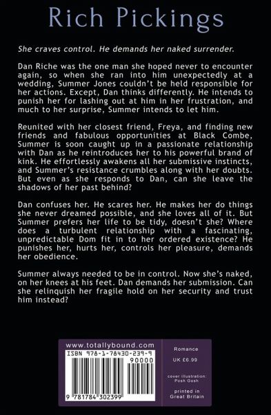 She craves control. He demands her naked surrender. Dan Riche was the one man she hoped never to encounter again, so when she ran into him unexpectedly at a wedding, Summer Jones couldn't be held responsible for her actions. Except, Dan thinks differently. He intends to punish her for lashing out at him in her frustration, and much to her surprise, Summer intends to let him. Reunited with her closest friend, Freya, and finding new friends and fabulous opportunities at Black Combe, Summer is soon caught up in a passionate relationship with Dan as he reintroduces her to his powerful brand of kink. He effortlessly awakens all her submissive instincts, and Summer's resistance crumbles along with her doubts. But even as she responds to Dan, can she leave the shadows of her past behind? Dan confuses her. He scares her. He makes her do things she never dreamed possible, and she loves all of it. But Summer prefers her life to be tidy, doesn't she? Where does a turbulent relationship with a fascinating, unpredictable Dom fit in to her ordered existence? He punishes her, hurts her, controls her pleasure, demands her obedience. Summer always needed to be in control. Now she's naked, on her knees at his feet. Dan demands her submission. Can she relinquish her fragile hold on her security and trust him instead?