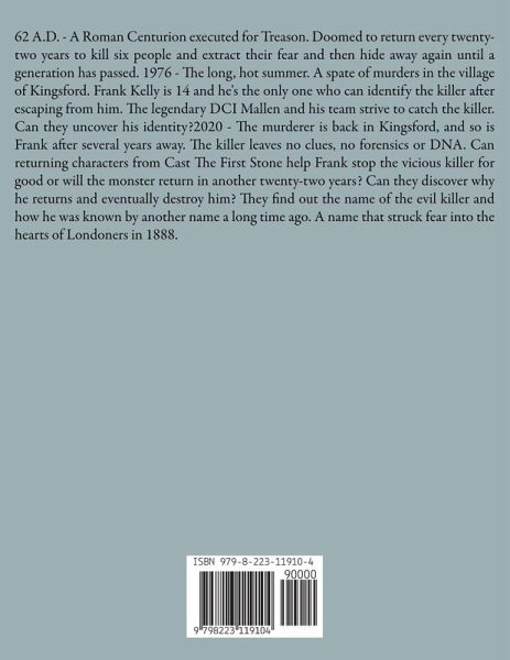 62 A.D. - A Roman Centurion executed for Treason. Doomed to return every twenty-two years to kill six people and extract their fear and then hide away again until a generation has passed. 1976 - The long, hot summer. A spate of murders in the village of Kingsford. Frank Kelly is 14 and he's the only one who can identify the killer after escaping from him. The legendary DCI Mallen and his team strive to catch the killer. Can they uncover his identity?2020 - The murderer is back in Kingsford, and so is Frank after several years away. The killer leaves no clues, no forensics or DNA. Can returning characters from Cast The First Stone help Frank stop the vicious killer for good or will the monster return in another twenty-two years? Can they discover why he returns and eventually destroy him? They find out the name of the evil killer and how he was known by another name a long time ago. A name that struck fear into the hearts of Londoners in 1888.